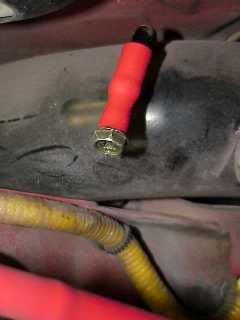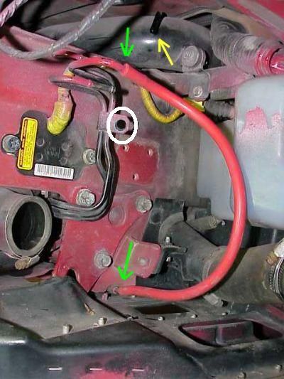 Nose panel is off, front fascia is on, splash shield underneath is removed. Inside front driver side frame rail, near the bumper, two bolts holding the hardlines need to be removed. The top bolt was also the ground for my aftermarket driver side horn, so obviously this bolt went back in.