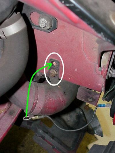 The insulated line under the white circle in the pic below is the same insulated line in the above pic, just below the open nipples. Trace that line forward to find a bolt that goes inside the white circle.