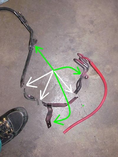 Here is the hardline tree cut out of the car. Green arrows show were bolts were removed, white arrows show cuts made with the Dremel. The original fuel vent lines on both ends are still in place. The entire length was replaced with a soft line.