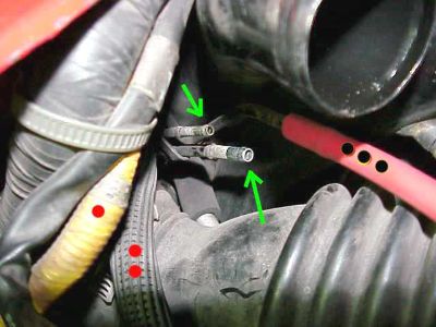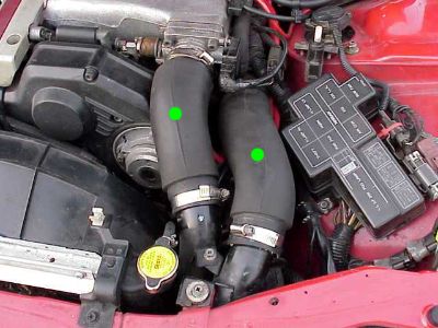 Remove the two, large intercooler hoses on the DS, shown by the green dots in the photo. These hoses are lot easier to remove when warm. You can either run the engine or warm the hoses with a hairdryer, if necessary. Each hose has two clamps holding it in place.