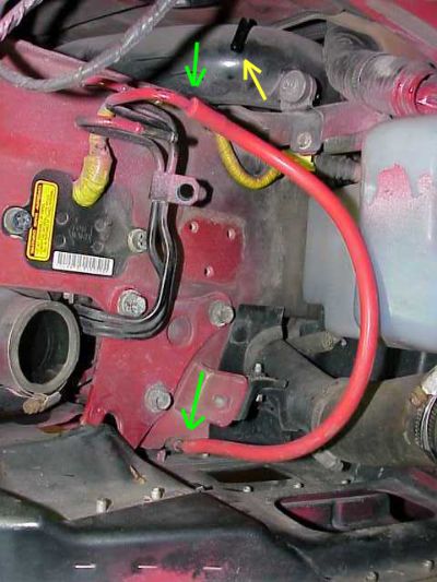 The line with the two red dots is the fuel vent line. See the section below on how to remove the leftover hardline "tree" if having open nipples under the hood bugs you.