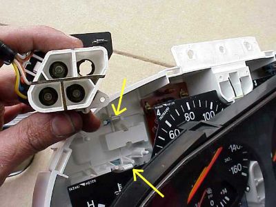The cluster is released by prying two clips shown by the yellow arrows. The cluster then easily pops out. Unscrew the bulb in the upper, right corner from behind.