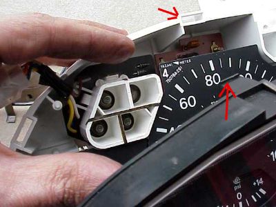 Here is a good link to gauge cluster removal. You can see in the final pics of that link that there are bulbs visible behind the gauge cluster. Unfortunately, none of those bulbs match up to our problem bulb in the picture above. In order to access that bulb, the clear plastic lens cover has to be separated from the white plastic back of the instrument cluster.