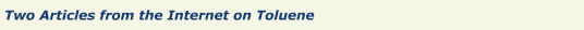 While all the other pages on this site are written by me, I did not see the purpose of researching and rewriting an entire article on toluene when I based 90% of what I knew about the subject on these two articles. The content of these articles is reposted here in its entirety. I made some minor formatting changes to make reading the articles easier. Any editorial comments I made are bracketed and in italics.