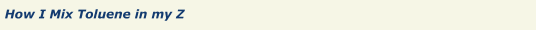 I use toluene when my tank is near empty. Once the reserve light comes on, I head straight for the gas station. The reserve light will flicker on and off for about twenty miles before staying constantly on. I pour in my single gallon of toluene using a long funnel (don't get it on the paint), and then I add four more gallons of gasoline. Voila', a ten percent mix, since there was still about five gallons in reserve. For roughly a twenty percent mix, I add another gallon of toluene. I personally have not run higher than a thirty percent mix. The improvement between twenty and thirty percent was not so great which led me to believe that pushing much beyond thirty percent was not worth the trouble and expense.