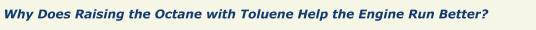 Using the same calculations, a 20 percent mix of toluene yields an octane of 97.2. So each ten percent addition of toluene roughly adds a little over two full octane points to the mix. A petroleum chemical engineer wrote me after reading this. He said that toluene does not mix in a linear fashion, so these calculations are really only rough aproximations. The exact numbers are not critical. Running too much toluene is not inherently dangerous. Toluene is harder to ignite than gasoline and running higher concentrations will lead to poor cold starting and eventually rough running, but the engine will not "blow up" if the toluene percentage is too high.