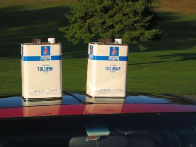 When I first wrote this article back in 2003, gas was less than $2 a gallon, and I was able to buy toluene for less than $9 per gallon in individual cans. For the two gallons in the pic below, I paid $14 each, plus tax in upstate New York during August, 2005. The price of toluene follows the price of gas. I don't expect the price to be coming back down to the $9 level any time soon. The older this article gets, the more ridiculous the price of toluene. However, there is a "wow" factor there that makes trying toluene worth it, IMO.