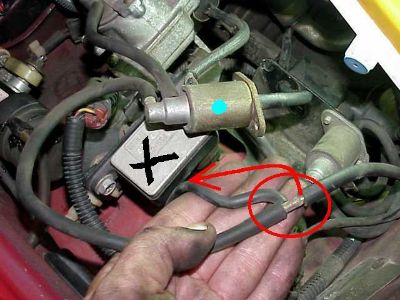 Disconnect the electrical engine harness for the AIV solenoid at the blue dot. Front of car is to the right.