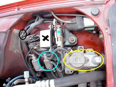 Front left corner under hood. Yellow circle is the AIV. Blue circle around AIV solenoid. Black X is boost sensor. Black circle is vacuum T shared by AIV and boost sensor. Blue dot is where the electrical engine harness connects to the AIV solenoid.