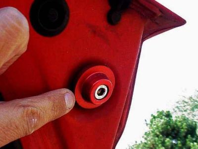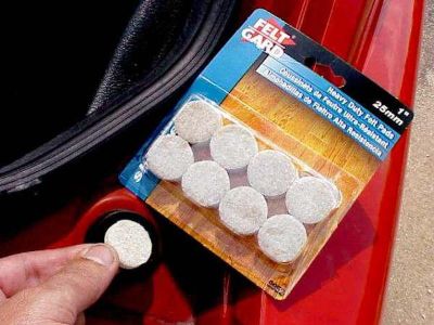 This is where the above bumper stop rests on the body. These black stock rubber bumpers get compressed with age. I bought these one inch felt pads in the furniture hardware section of a Home Depot. They have adhesive on one side and fit perfectly inside as shown.