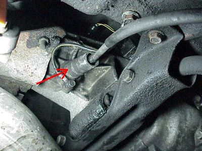 Instead of pulling the whole sensor out and having my manual tranny fluid run out onto the garage floor, I just unscrewed this collar where the speedo cable screws into the rear passenger side on the transmission.