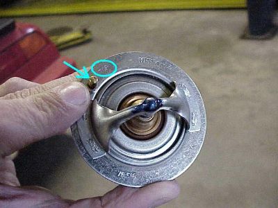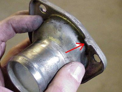 The thermostat housing has a top, as shown by the tab next to the arrow. Clean the housing, especially at its mating surface and where the radiator hose slips back on.