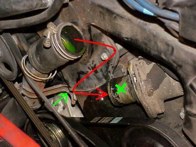The lower radiator pipe is attached to the thermostat housing. First remove a 12 mm mounting bolt for the radiator hardpipe shown at the green arrow. This will allow the short rubber radiator hose to be pulled off the thermostat housing. Loosen the clamps on the short rubber radiator hose, grunt and twist, pull the lower radiator hose off the thermostat housing, shown by the green X.