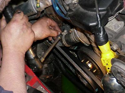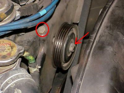 Remove the fan clutch, fan and radiator shroud as in the first section. The fan can be removed before the idler pulley and bracket, personal preference, doesn't matter.