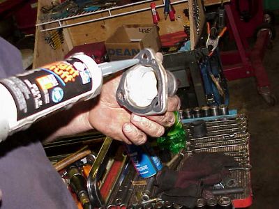 The same "Right Stuff" on the mating surface of the lower half of the thermostat housing. The thermostat is already back in the engine, and this housing will cover the thermostat.