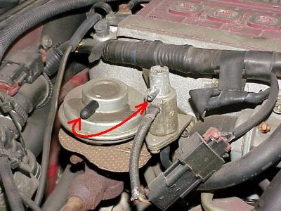 This time I removed the vacuum line connecting the EGR solenoid on the right, to the EGR valve on the left. Then I capped both nipples (the cap is not on the solenoid in the pic, yet).