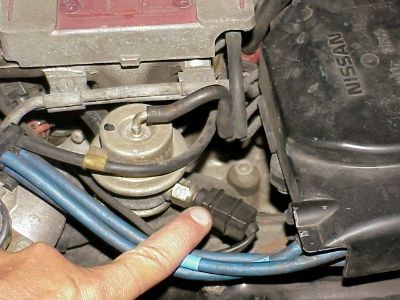 I didn't know exactly what I was looking at, but when I wiggled the connector at this sensor, it was crackly and sticky with dried antifreeze. I disconnected and cleaned the connector, sprayed it with WD-40, and reconnected it. The next morning's cold start was flawless. I found out later by looking in my factory service manual that this was the connector to the fuel temperature sensor. The car seemed back to normal until a few days later the cold start stumble returned, though not nearly as bad. After about a minute the car still ran perfectly. I searched on z31.com and the closest post I could find to my problem implicated a faulty exhaust gas recirculation (EGR) valve or solenoid.