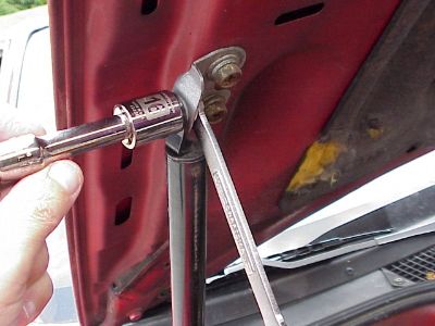 16mm socket and 10mm box wrench used to remove the upper end of the strut from the mounting bracket attached to the hood.