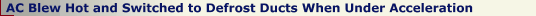 My AC worked good unless I accelerated. Then the cold air would stop coming out of the vent ducts, switch to the defrost ducts, and blow hot. As soon as I stopped accelerating the AC would resume normal operation, although it took 15 seconds or so for the air coming out of the vents to cool back down.