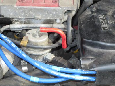 Close-up of above. Replacing the old loose vacuum hose with this new short piece of red silicone hose.