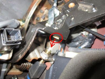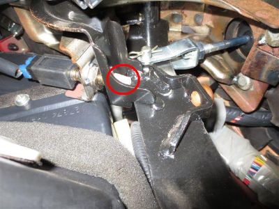 Shown is the clutch pedal depressed, the wide end of the cork is circled, and the contact it makes with the white tip on the electric switch at the arrow when the pedal is released, which disengages the cruise control.