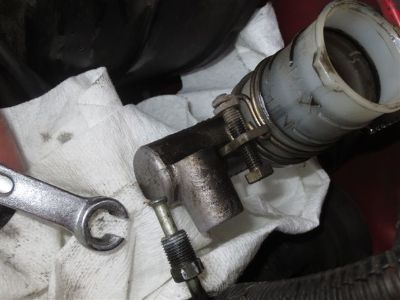 This is under hood, the MC still attached to the firewall by two 17mm nuts. Rags are stuffed under MC to catch fluid. Hard line disconnected with a 10mm FLARE nut wrench.