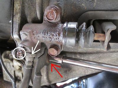 Red arrow shows a transmission bolt and grounding bracket I had to remove first before I could get a wrench on the old clutch line at the white arrow.