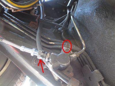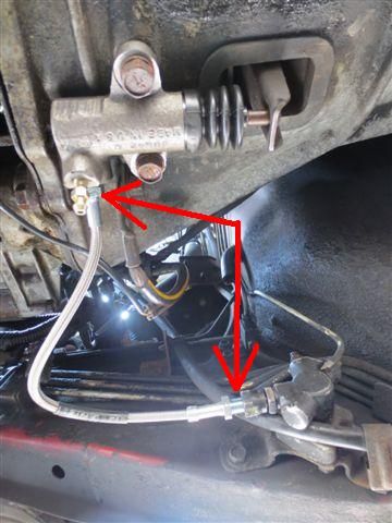 Under car, other end of soft clutch line goes to his clutch damper. The damper has no moving parts so I did not replace it. New clutch line installed at arrow. The nuts on the end of the clutch line do NOT turn because the damper had this feeder nut at arrow which did all the turning.